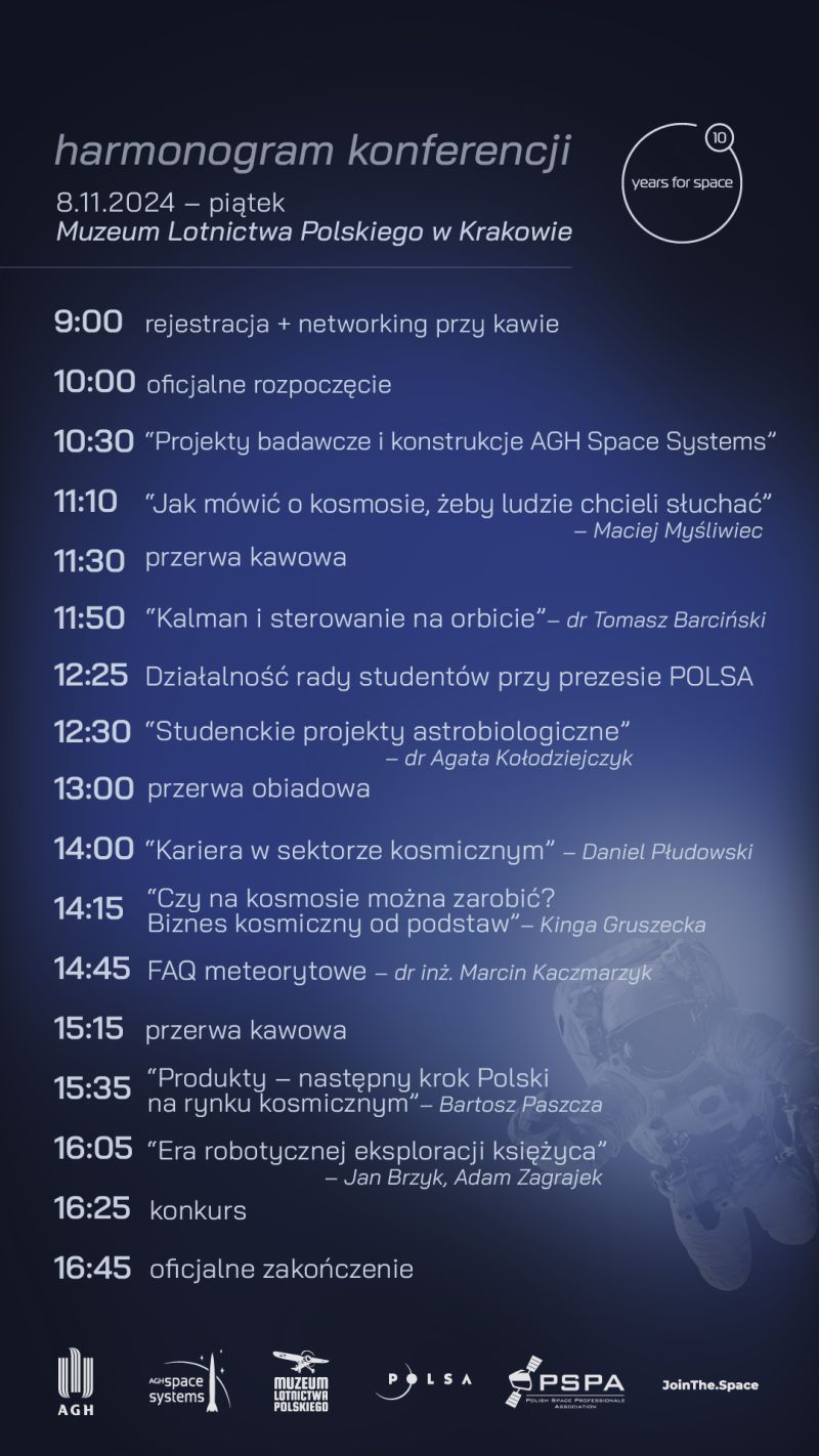 Zapraszamy na pierwszą konferencję kosmiczną – 10 years for space organizowaną przez koło AGH Space Systems. To będzie niezapomniane wydarzenie, na które zapraszamy wszystkich pasjonatów kosmosu!
